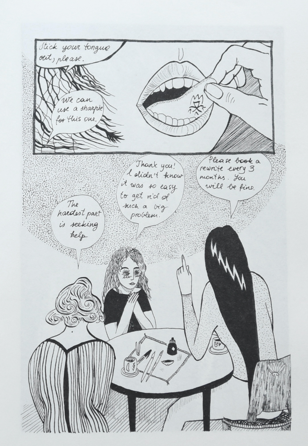 ‘Pathos’ is the first graphic novel by Dovilė Šimonytė. Its semi-fictional narrative is based upon both personal and less personal experiences of dealing with mental and women’s health, the treatments and complications. Stories were gathered in saunas, coffee shops, and kitchens under the influence of heat, nudity, caffeine, and trust. It is set in a world where illness is on par with superstition and treatments come from charlatans or local witches who apply rather bizarre methods and techniques. Collectively, it takes the form of a pathological lie entwined with a wellness cult, long queues, and hope to get better.